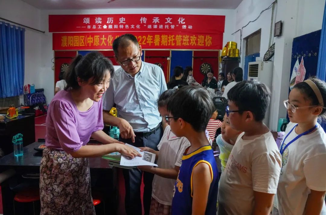 为办妥暑期托管班,,,,,让孩子们在玩中学、学中乐、乐中思,,,,,8月2日,,,,,濮阳市总工会为孩子们送来《颂读历史 传承文化爱心托管知识读本》、濮阳特色文化课和中原卫风乐团演出。。。。。通过特殊课堂让托管班的孩子们进一步相识自己的家乡、优异历史文化,,,,,度过一个有学有玩,,,,,有欢喜有收获的假期。。。。。